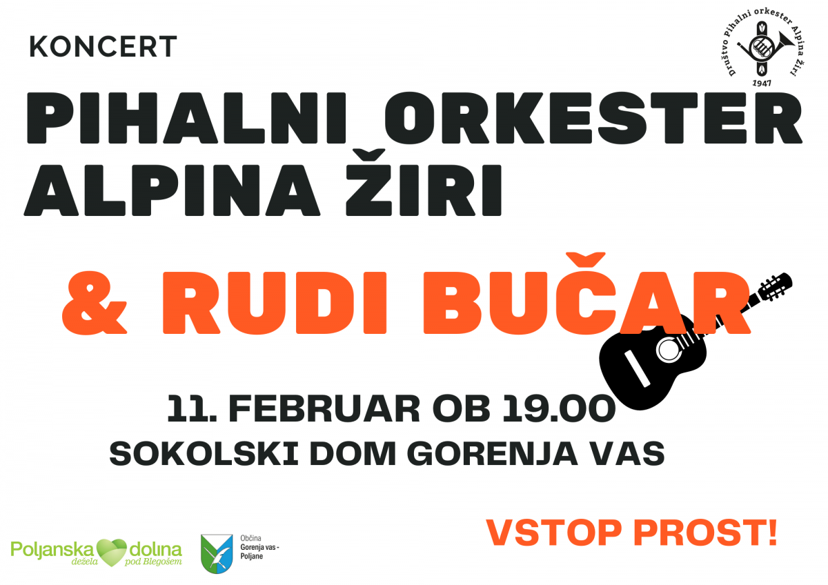 Občina Gorenja vas – Poljane vabi na koncert pihalnega orkestra Alpina Žiri z gostom Rudijem Bučarjem.