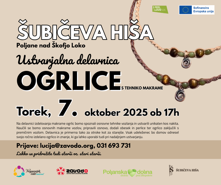 Delavnica je primerna tako za otroke kot za starejše. Vsak udeleženec bo domov odnesel svojo ročno izdelano ogrlico in znanje, ki ga lahko uporabi tudi pri nadaljnjem ustvarjanju.