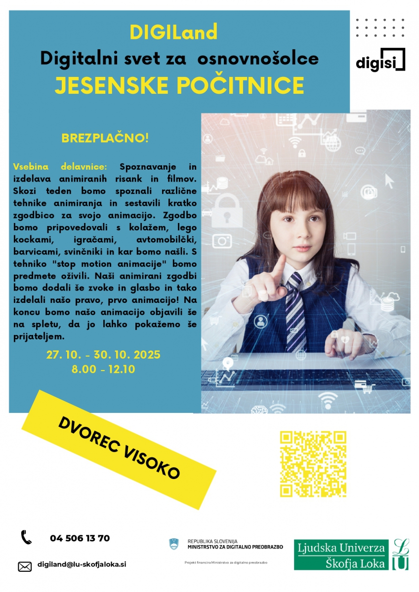 Med jesenskimi počitnicami, od 27. do 30. oktobra 2025, bodo na Dvorcu Visoko potekale brezplačne digitalne delavnice DIGILand – otroci se bodo spoznali z animacijo in ustvarjanjem lastnih kratkih filmov.
