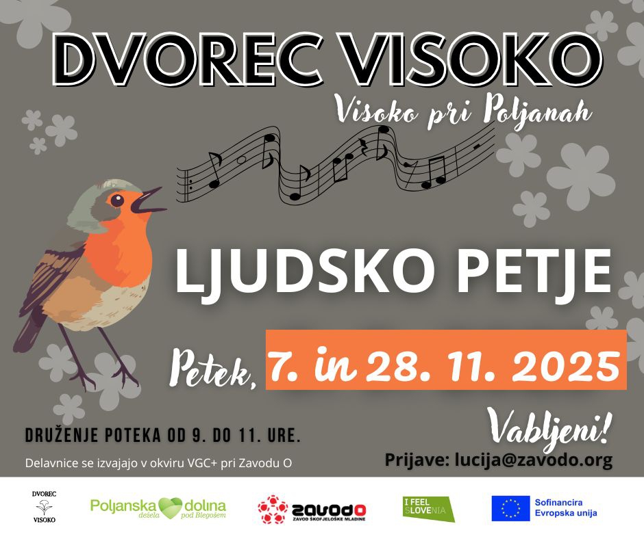 Vabimo vas, da se pridružite delavnicam ljudskega petja, ki bodo v novembru potekale ob petkih med 9. in 11. uro na Dvorcu Visoko. Delavnice bo vodila Lucija Kavčič.