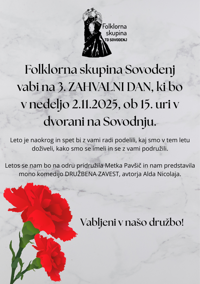 Folklorna skupina TD Sovodenj vas vabi na 3.Zahvalni dan, ki bo v nedeljo, 2.11.2025 ob 15.00.uri v kulturni dvorani na Sovodnju.