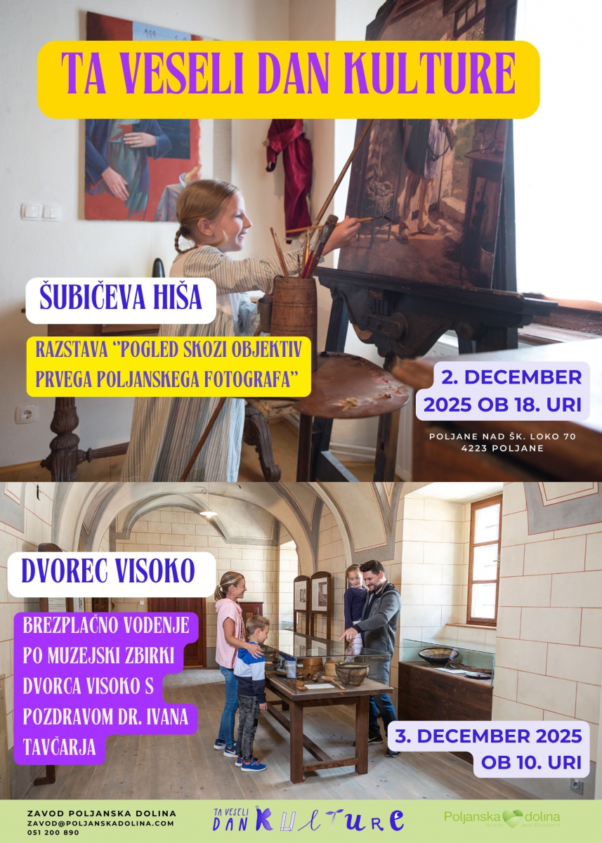 V sredo, 3. decembra, bo ob praznovanju Ta veselega dneva kulture organizirano brezplačno vodenje po muzejski zbirki Visoška domačija pripoveduje po Dvorcu Visoko ob 10. uri. Uvodoma pa vas bo pozdravil tudi sam dr. Ivan Tavčar.