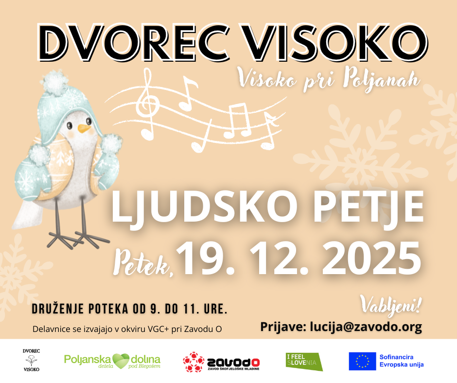 Vabimo vas, da se pridružite delavnicam ljudskega petja, ki bodo v novembru potekale ob petkih med 9. in 11. uro na Dvorcu Visoko. Delavnice bo vodila Lucija Kavčič.