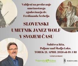 Spoznali bomo življenje in delo slikarja Janeza Wolfa (1825–1884), pomembnega ustvarjalca nabožnih podob v oljni tehniki in izjemnega freskanta slovenskih cerkva. Predavanje bo osvetlilo tudi njegovo vlogo mentorja mlajši generaciji umetnikov, med katerimi izstopajo Janez in Jurij Šubic ter Anton Ažbe.