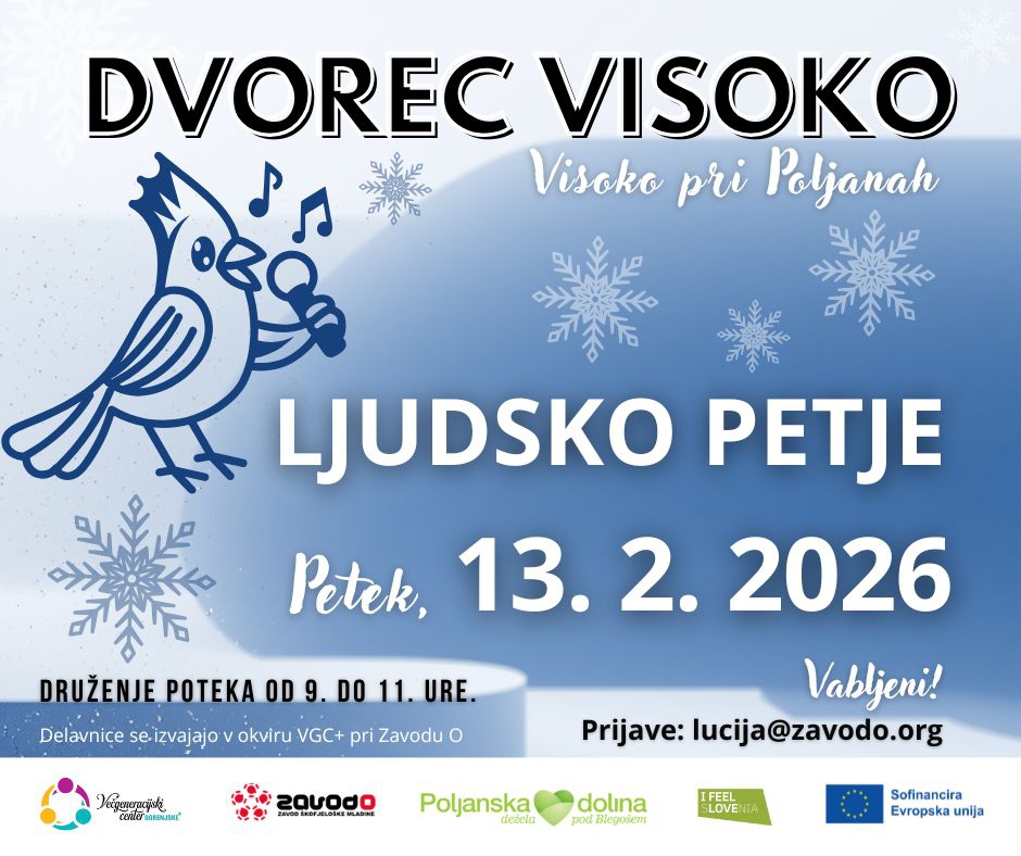 Vabimo vas, da se pridružite delavnicam ljudskega petja, ki bodo v 13. februarja v petek med 9. in 11. uro na Dvorcu Visoko. Delavnice bo vodila Lucija Kavčič.