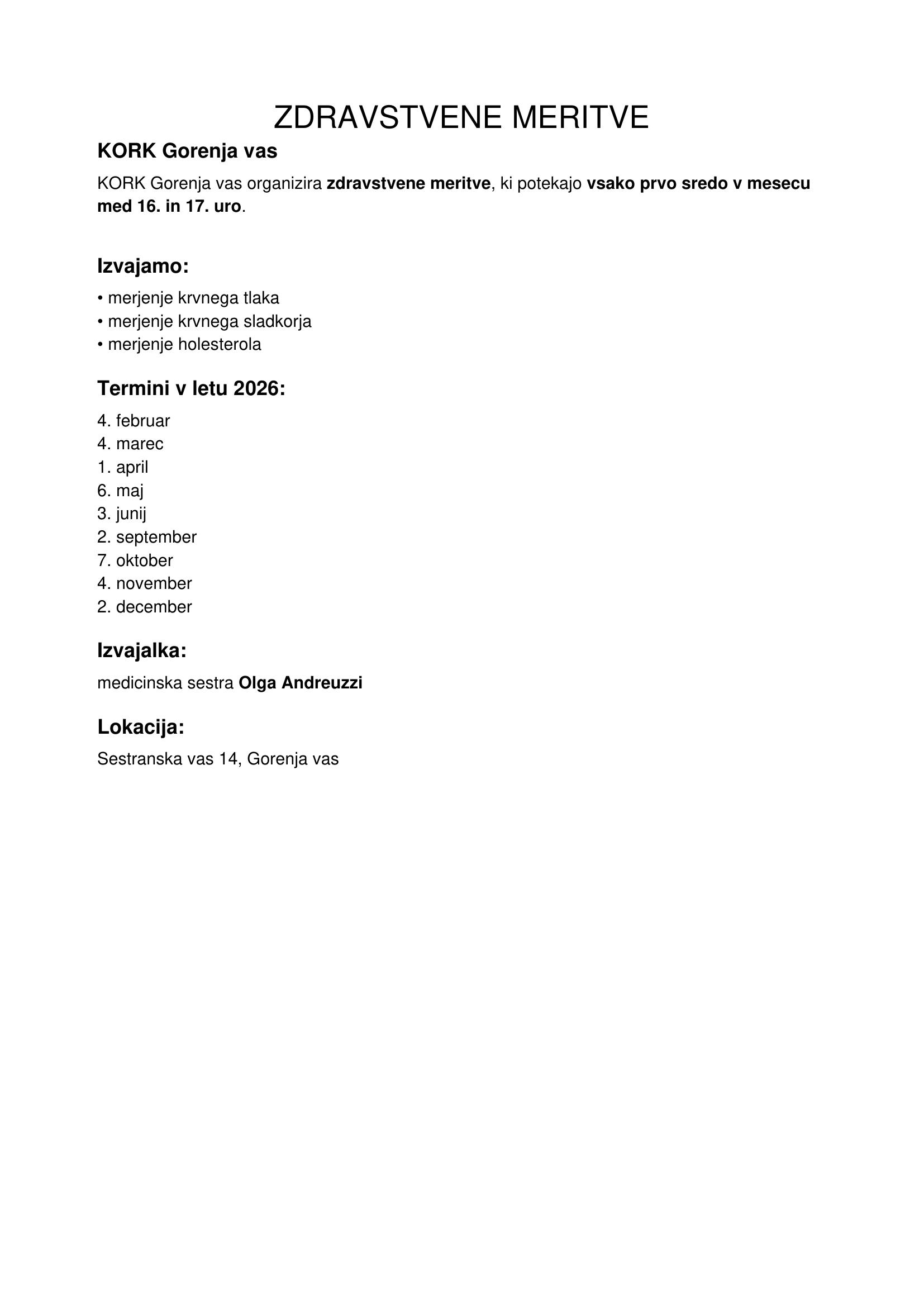 Vsako prvo sredo v mesecu KORK Gorenaj vas organizira zdravstvene meritve - meritve krvnega tlaka, sladkorja in holesterola. - 4.2.2026 - 4.3.2026 -1.4.2026 - 6.5.2026 - 3.6.2026 - 2.9.2026 - 7.10.2026 - 4.11.2026 - 2.12.2026 Meritve opravlja medicinska sestra Olga Andreuzzi in potekajo na naslovu Sestranska vas 14, Gorenja vas.