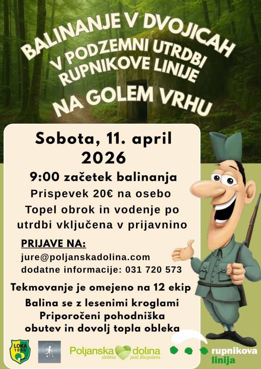 V soboto, 11. aprila, Zavod Poljanska dolina v sodelovanju z balinarsko sekcijo Turističnega društva Sovodenj in Balinarskim klubom Loka 1000 iz Škofje Loke pripravlja balinarski turnir v podzemni slemenski utrdbi Rupnikove linije na Golem vrhu.