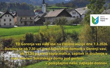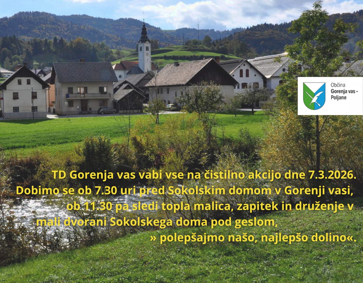 Č𝗜𝗦𝗧𝗜𝗟𝗡𝗔 𝗔𝗞𝗖𝗜𝗝𝗔 – 𝟳. 𝟯. 𝟮𝟬𝟮𝟲 Turistično društvo Gorenja vas vabi vse krajane in prijatelje naše doline,...